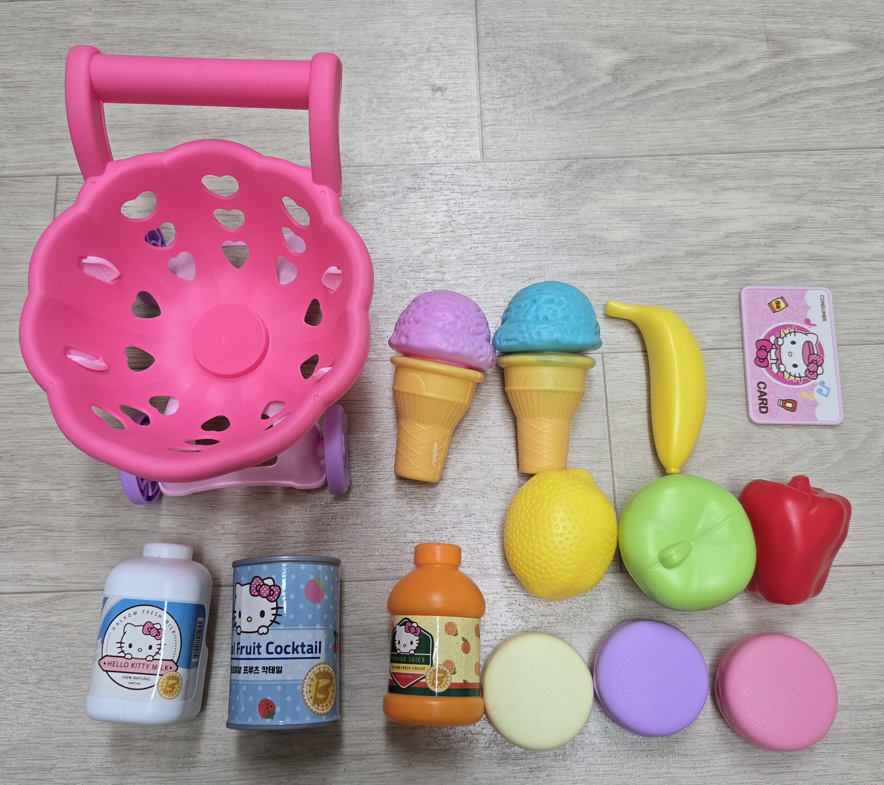 헬로키티와 함께 디저트 쇼핑해요,.버튼을 누르면 삑 소리가 나고 다양한 소품들이 들어있어요.
