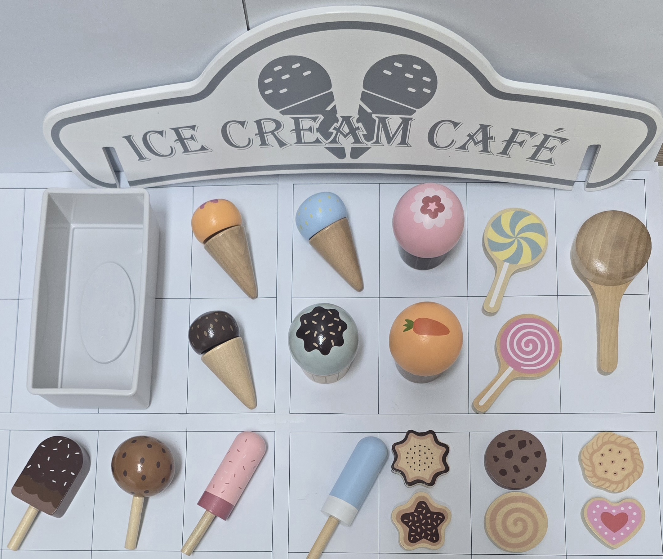 아이스크림,컵케이크,쿠키등 다양한 구성으로 아이스크림가게, 디저트카페등을 할 수 있는 원목 놀이감입니다.