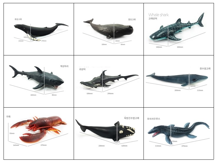 특징을 정교하게 살린 모형으로 말랑말랑 부드러운 재질의 해양동물세트입니다.