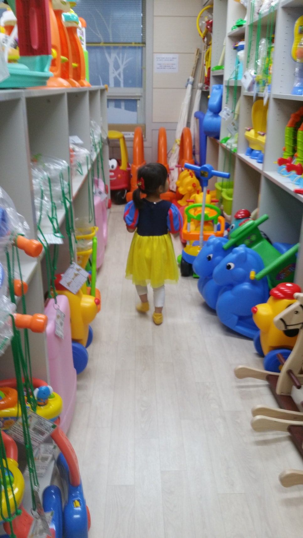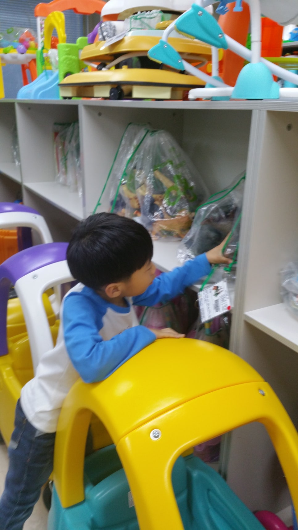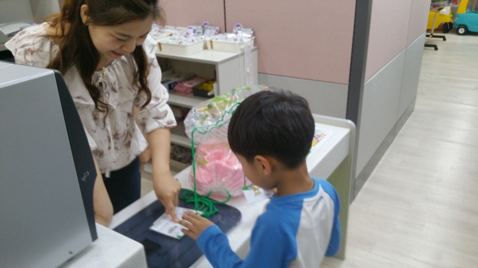 오빠는 자기가 한번 해보겠다며 엄마 회원카드 보여드리고 삑~ 하고나서 장난감 가져왔죠~저기 초록색 스티커는 소형장난감이란 표시! 개인회원은 소형장난감 2점, 혹은 대형장난감(빨강스티커) 1점 대여가 가능하답니다~
