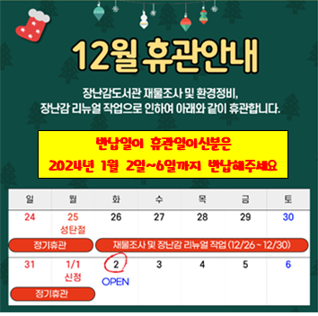 2023.12월 휴관안내 등록일 23-12-07 10:25 조회 275 본문 2023.12월 휴관안내 이전글2024. 1월 새로운 장난감이 들어왔어요. 다음글2023년 장난감도서관 이용자인식 및 만족도 조사실시(12.1~12.23까지) 목록 댓글목록 0 댓글목록 등록된 댓글이 없습니다.