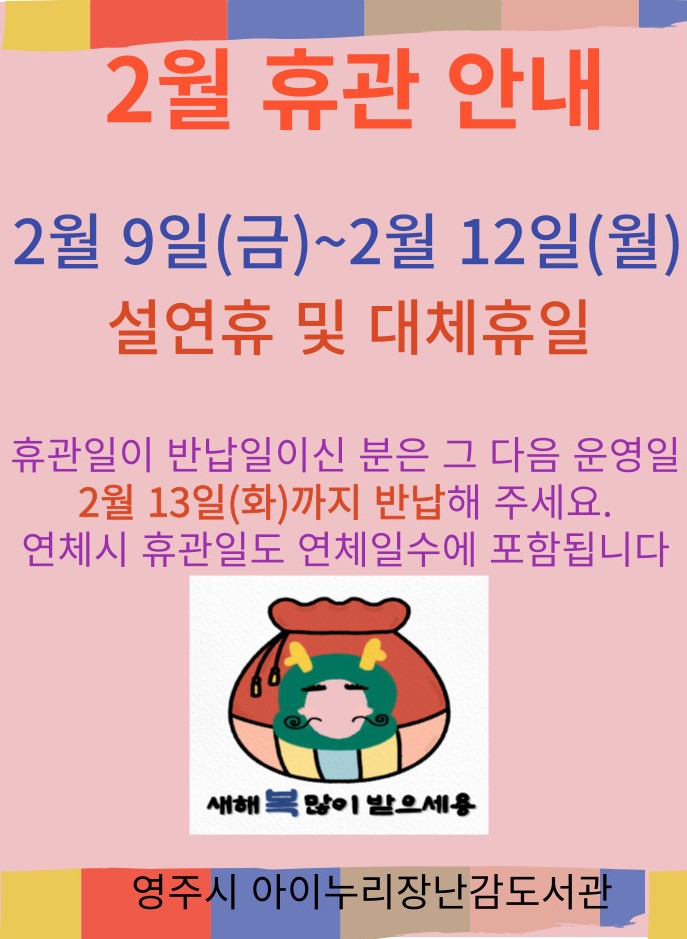 2월 휴관안내(설명절) 등록일 24-02-06 10:50 조회 259 본문 2월 휴관안내(설명절) 이전글홈페이지 리뉴얼 다음글2024. 1월 새로운 장난감이 들어왔어요. 목록 댓글목록 0 댓글목록 등록된 댓글이 없습니다.