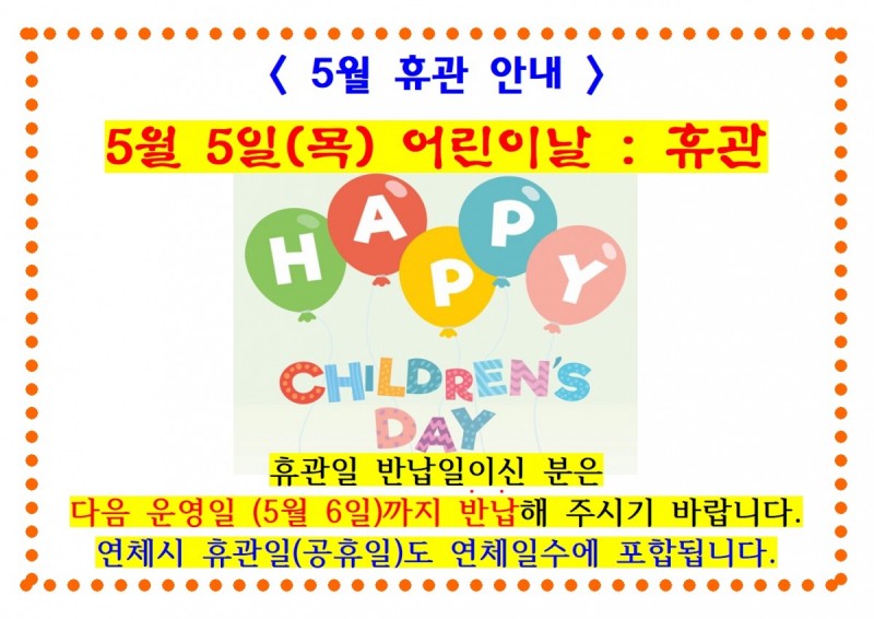 5월 휴관안내 등록일 22-04-28 14:36 조회 229 본문 <5월 휴관안내> 이전글5월 가정의달 어린이날 선물 이벤트 다음글도란도란 실내놀이터 4월 26일(화) 정상 운영합니다. 목록 댓글목록 0 댓글목록 등록된 댓글이 없습니다.