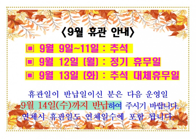 9월 휴관안내 등록일 22-09-07 10:12 조회 241 본문 9월 휴관안내 이전글9월 22일(목) 운영시간 조정안내 다음글통통 육아콘서트 - ---> 투맘쇼 목록 댓글목록 0 댓글목록 등록된 댓글이 없습니다.