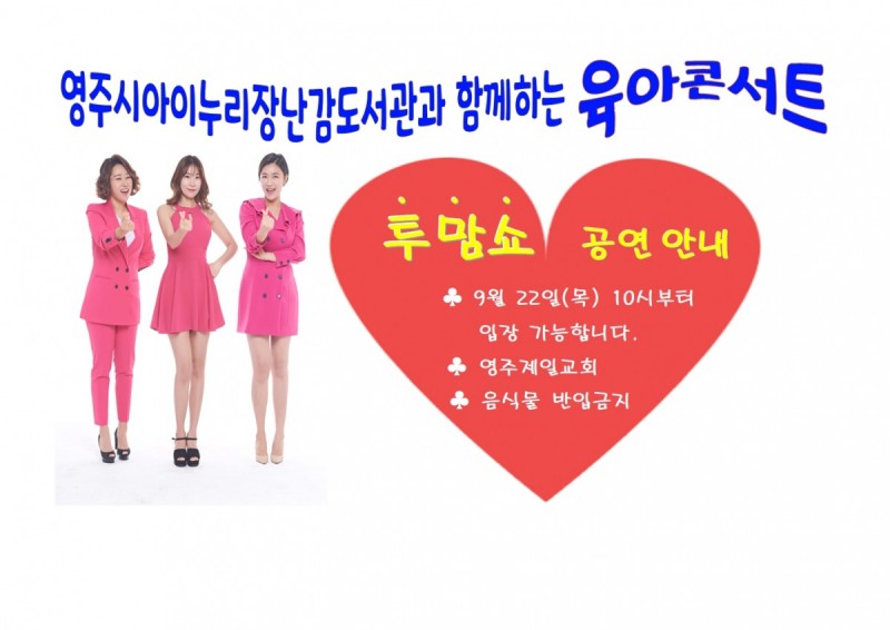 9월22일(목)투맘쇼 공연안내 등록일 22-09-21 16:47 조회 268 본문 9월22일(목)투맘쇼 공연안내 이전글2022.11월 새로운 장난감이 들어왔어요. 다음글9월 22일(목) 운영시간 조정안내 목록 댓글목록 0 댓글목록 등록된 댓글이 없습니다.