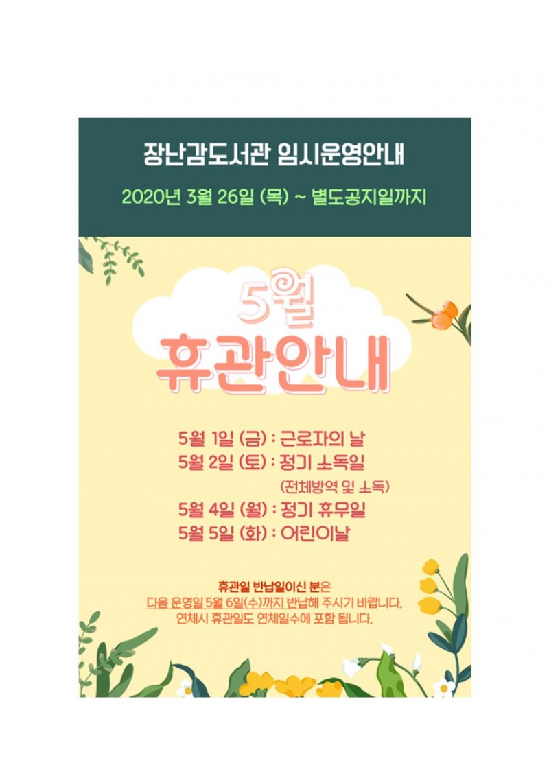 5월 휴관 안내 등록일 20-04-25 10:40 조회 226 본문 5월 휴관 안내 이전글장난감 배달서비스 5월 14일(목) 부터 시작합니다~ 다음글회원가입기간 자동 연장안내 목록 댓글목록 0 댓글목록 등록된 댓글이 없습니다.
