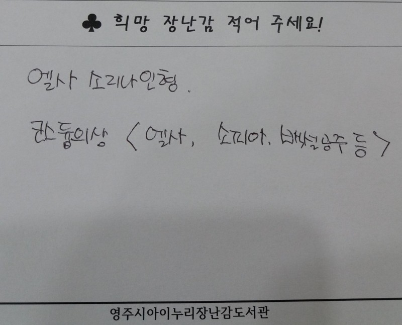 장난감도서관님의 댓글 장난감도서관 작성일 18-09-21 15:19 코스듑 의상 ( 엘사, 소피아, 백성공주, 신데렐라, 안나, 미니마우스, 벨 ) 새로운 장난감 구입 하여 현재 장난감 대여중 입니다^^(2018.9.21) 엘사 소리나는 인형은 현재 장난감 대여중에 있습니다. 늘 장난감도서관에 관심 가져주셔서 감사합니다. 코스듑 의상 ( 엘사, 소피아, 백성공주, 신데렐라, 안나, 미니마우스, 벨 ) 새로운 장난감 구입 하여 현재 장난감 대여중 입니다^^(2018.9.21) 엘사 소리나는 인형은 현재 장난감 대여중에 있습니다. 늘 장난감도서관에 관심 가져주셔서 감사합니다.