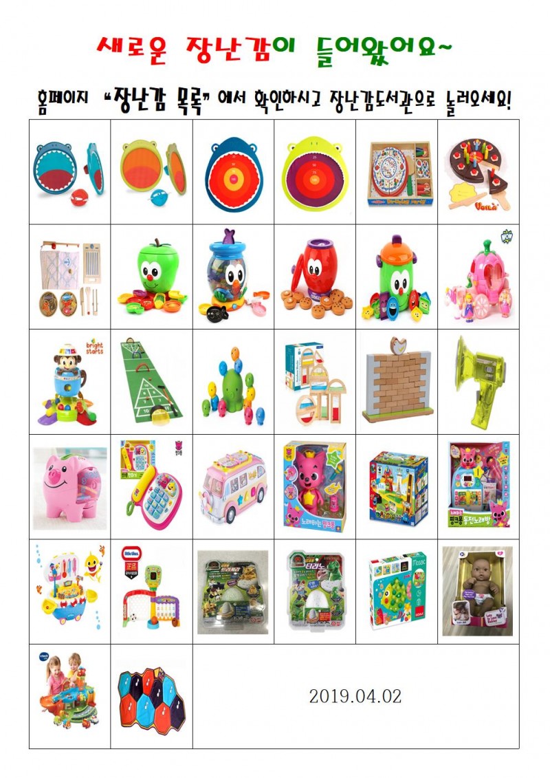 새로운 장난감이 들어왔어요~~ 등록일 19-04-02 11:06 조회 389 본문 새로운 장난감이 들어왔어요~~ 흥미진진 장난감 대여/반납 및 도란도란 놀이방으로 놀러오세요~~*^^* 이전글5월1일 근로자의날 휴관 다음글도란도란 놀이방 편백청소^^ 목록 댓글목록 0 댓글목록 등록된 댓글이 없습니다.