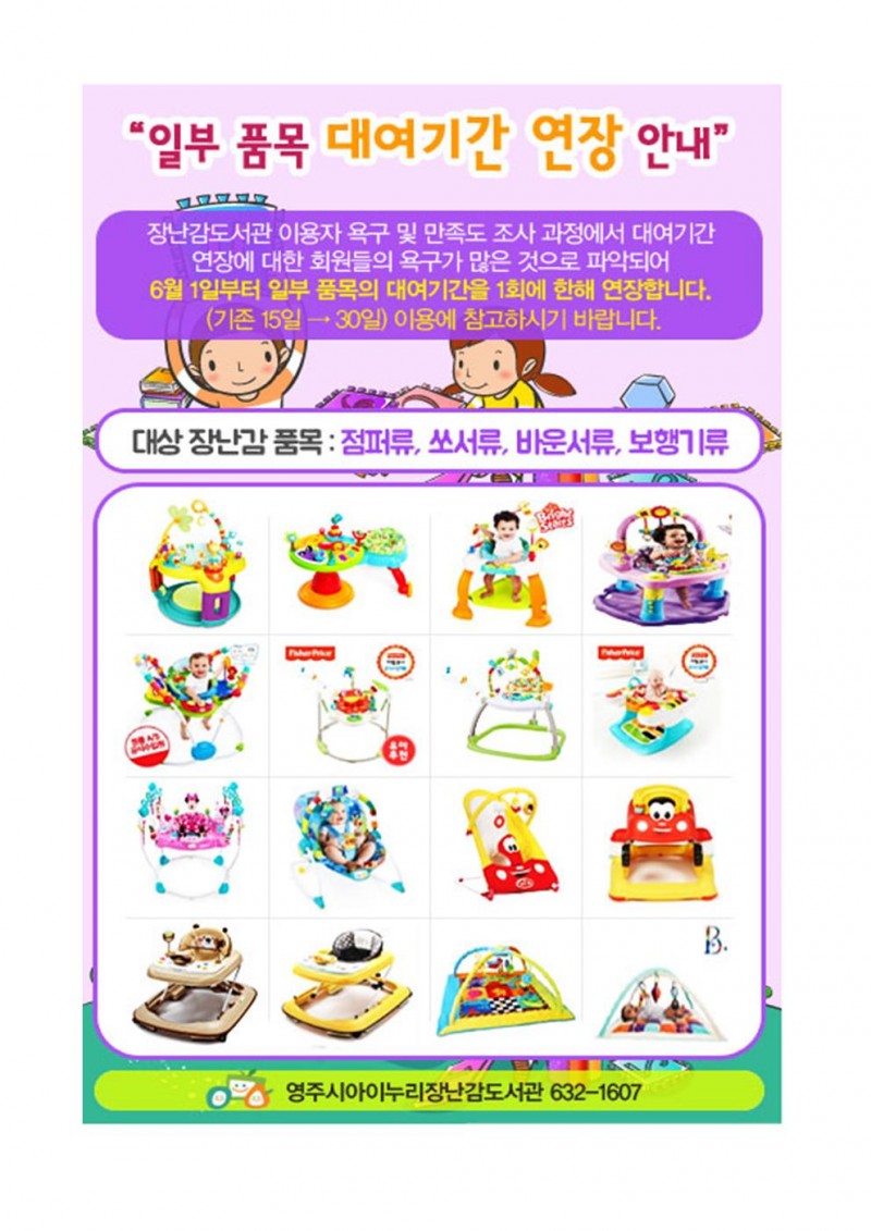 일부 품목 대여기간 연장 안내 등록일 18-06-01 14:07 조회 443 본문 일부품목 대여기간 연장안내 이전글이용후기 공모전 수상자 안내 다음글새로운 장난감이 들어왔어요~^^ 목록 댓글목록 0 댓글목록 등록된 댓글이 없습니다.