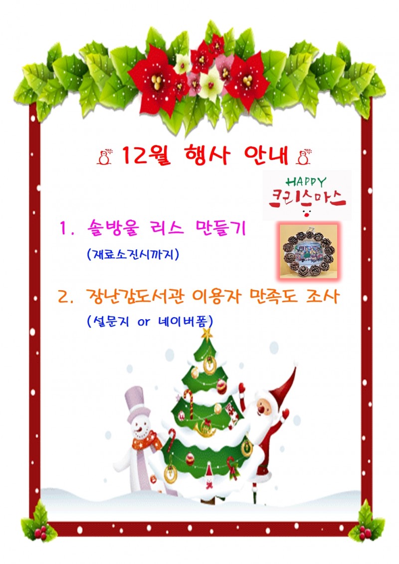 12월 행사 안내 등록일 22-12-02 09:57 조회 250 본문 12월 행사 안내 이전글12월 휴관안내 다음글장난감도서관 이용자 인식 및 운영 만족도 조사 목록 댓글목록 0 댓글목록 등록된 댓글이 없습니다.