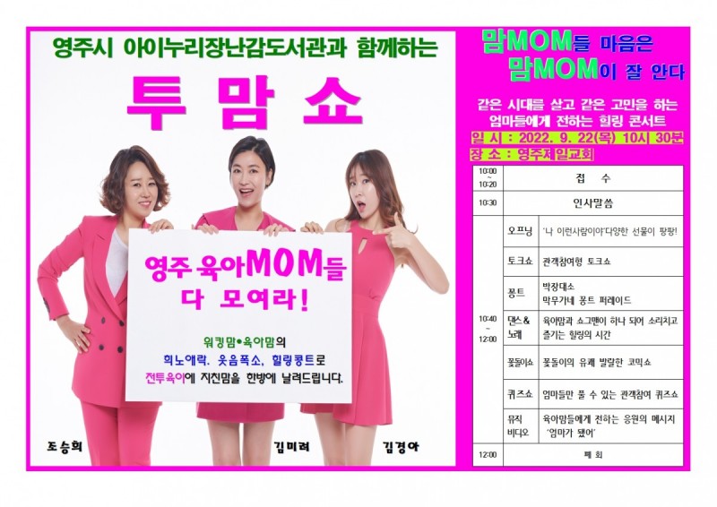 통통 육아콘서트 - ---> 투맘쇼 등록일 22-08-30 15:13 조회 786 본문 통통 육아콘서트 : 김미려, 김경아, 조승희와 함께하는 개그토크쇼 <투맘쇼 > ★ 공연신청: 1.주소 클릭후 기본정보 입력해주세요=====>>>> http://naver.me/FABnnqq5 이전글9월 휴관안내 다음글8월 휴관 안내 목록 댓글목록 2 댓글목록 이윤경님의 댓글 이윤경 작성일 22-08-31 12:35 신청하고 당첨 되면따로 연락이 오나요? 신청하고 당첨 되면따로 연락이 오나요? 장난감도서관님의 댓글의 댓글 장난감도서관 작성일 22-08-31 13:09 네~ 문자발송해드립니다. 네~ 문자발송해드립니다.
