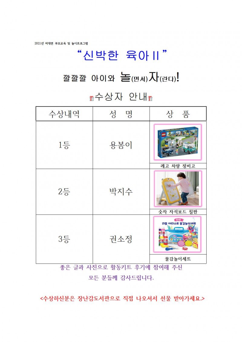 <2021>신박한 육아 아이와 놀자! 활동키트 후기 수상자 안내 등록일 21-10-20 11:07 조회 281 본문 2021년 신박한 육아 아이와 놀자! 활동키트 후기 수상자 안내 이전글새로운 장난감이 들어왔어요~^^ 다음글10월 9일(한글날) 휴관 목록 댓글목록 0 댓글목록 등록된 댓글이 없습니다.