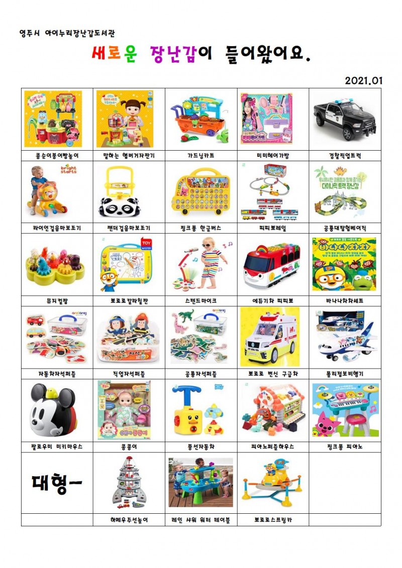 2021.1월 새로운 장난감이 들어왔어요. 등록일 21-01-20 09:57 조회 290 본문 2021.1월 새로운 장난감이 들어왔어요. 이전글2월 휴관안내 다음글반납집중기간 운영 안내 목록 댓글목록 0 댓글목록 등록된 댓글이 없습니다.