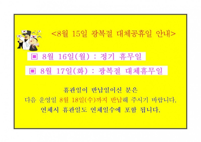 <광복절 대체 공휴일 안내> 등록일 21-08-14 10:01 조회 235 본문 광복절 대체 공휴일 안내 이전글9월 휴관안내 다음글2021.7월 새로운 장난감 목록 댓글목록 0 댓글목록 등록된 댓글이 없습니다.