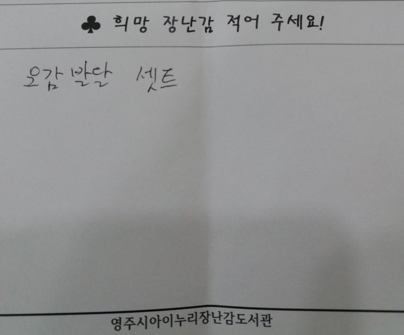 장난감도서관님의 댓글 장난감도서관 작성일 18-09-21 15:28 오감 촉감 놀이 및 헝겊책 등 현재 대여중에 있습니다. 늘 장난감도서관에 관심 가져주셔서 감사합니다. 오감 촉감 놀이 및 헝겊책 등 현재 대여중에 있습니다. 늘 장난감도서관에 관심 가져주셔서 감사합니다.