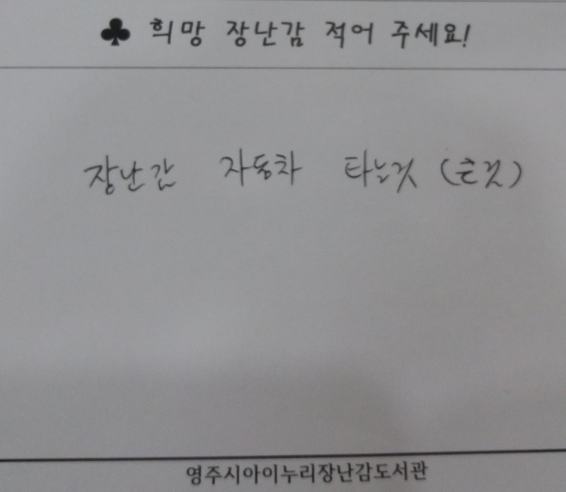 희망 장난감 요청합니다. 본문 작성자 장난감도서관 등록일 18-04-03 14:19 조회 99 희망 장난감 요청합니다. 이전글희망 장난감 요청합니다. 다음글희망 장난감 요청합니다. 목록 댓글목록 1 댓글목록 장난감도서관님의 댓글 장난감도서관 작성일 18-04-03 14:55 병아리 자동차, 2인용밴, 멜로디 자동차, 코지쿠페 등 다양한 자동차들이 현재 대여중에 있습니다. 늘 장난감도서관에 관심 가져주셔서 감사합니다. 병아리 자동차, 2인용밴, 멜로디 자동차, 코지쿠페 등 다양한 자동차들이 현재 대여중에 있습니다. 늘 장난감도서관에 관심 가져주셔서 감사합니다.