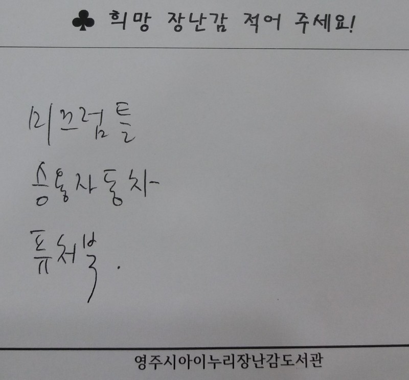 커뮤니티 도서관 소개 대여안내 장난감 검색 놀이방 신청 프로그램 토이뱅크 커뮤니티 희망장난감 요청 공지사항 갤러리 자주하는 질문 자유게시판 희망장난감 요청 장난감배달 신청 백일/돌 대여 신청 장난감 안전교육영상 발달 단계별 장난감 정보 누리마켓
